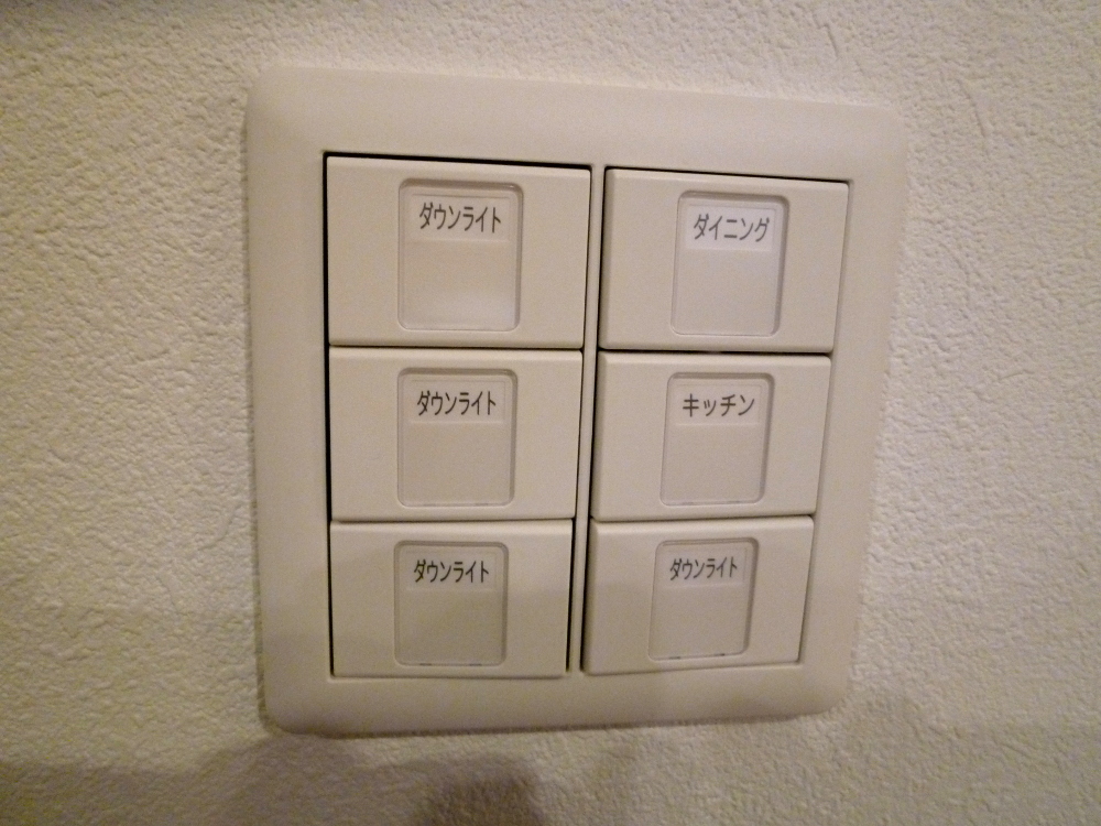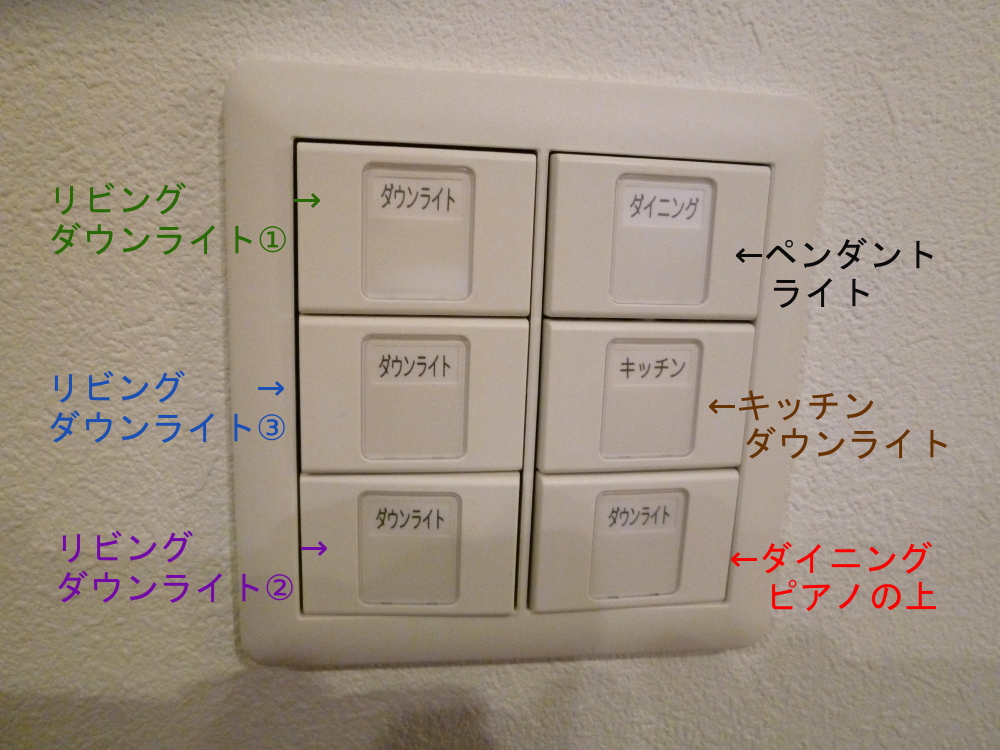 もうね、ただでさえ紛らわしいダウンライト×4のスイッチなのに、リビングとキッチンで並び方のパターンが違うなんて、どれがどの照明なのか覚えられませんよね~(^▽^;)