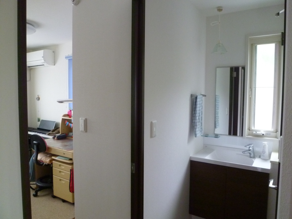 こんな感じで、娘たちの部屋を出てすぐのところにあります。この位置に洗面台を設置したのは大成功でした♪