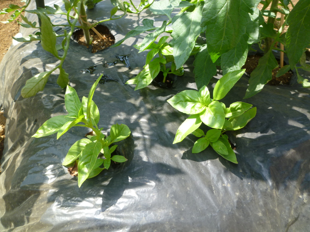 しばらく水に差しておくと根っこが出てきたので、それを菜園コーナーのトマトの根元近くに植えておきました。