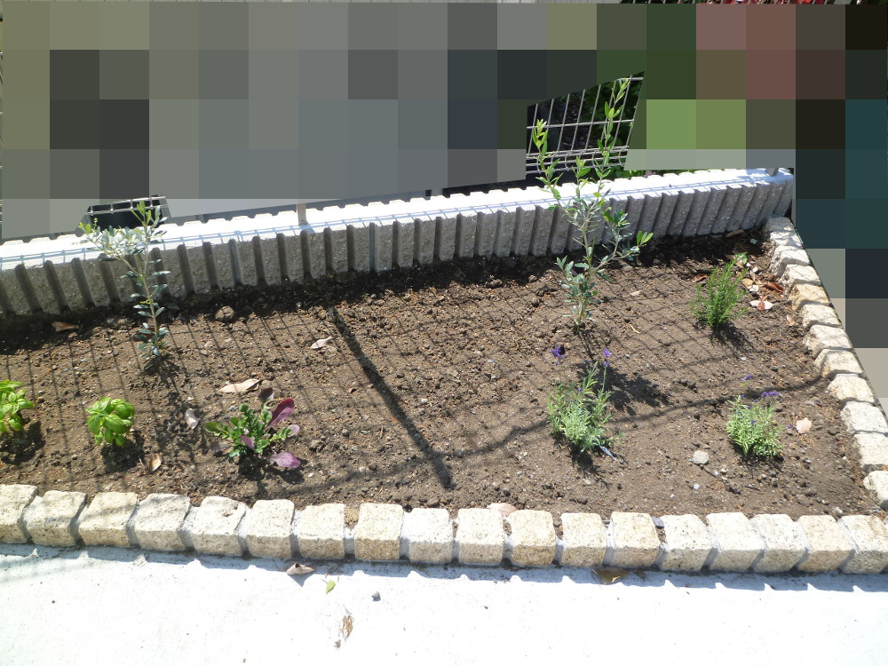 別の花壇には、オリーブの苗木2本とハーブを植えました。