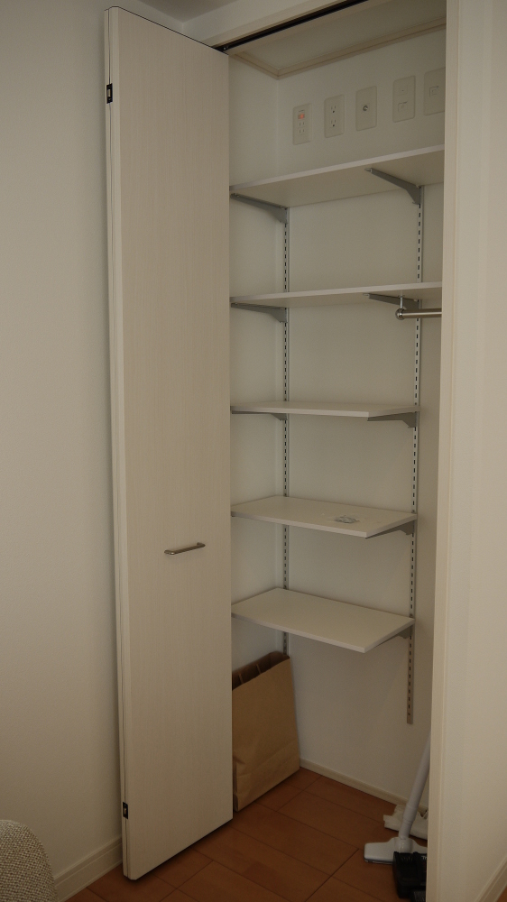 元々はもっと広いスペースを確保していて、飾り棚とかアクセントクロスとか色々妄想していたのですが、紆余曲折あって隅に妻棚収納を設けることになり。